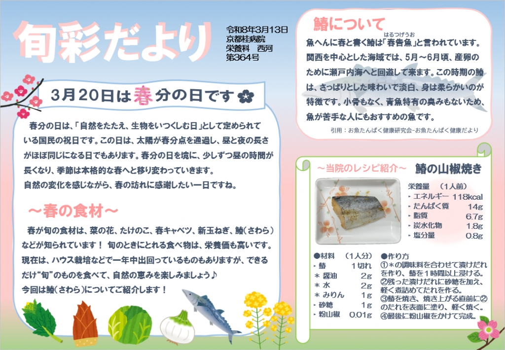 今回の旬彩だよりは春告魚(はるつげうお)と言われている鰆(さわら)について紹介しています🐟
