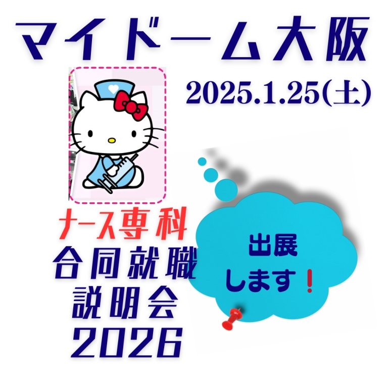 この後、1月18日(土)はマイナビWEBLiveに参加します。オンラインで、当院の説明も、ぜひお聞きください!1月25日(土)はナース専科合同就職説明会inマイドーム大阪に、参加します。