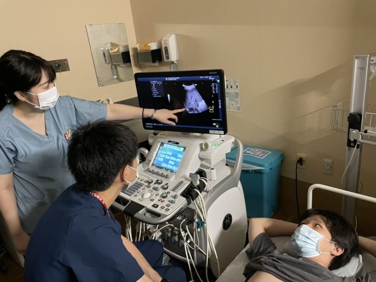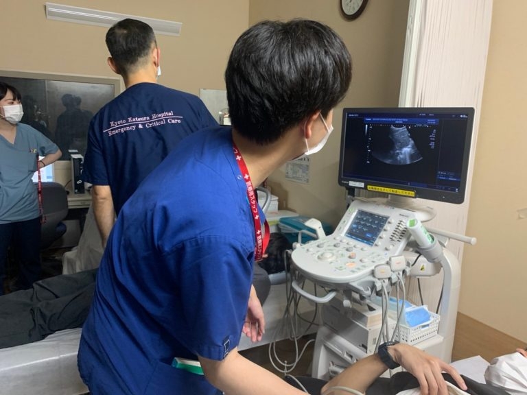 普段の水曜日勉強会は救急症例検討会ですが、7/7から3回はなんとエコー勉強会!!7/7はFASTの練習、7/14は心エコーでした!エコー勉強会では2年目の先輩がエコーの当て方の見本を見せてくれたり、所見の取り方や評価方法を丁寧に教えてくれたりします。そして足りない部分やエコーのコツを救急科部長の先生が補足して下さいます。今回練習したエコーを救急の現場でたくさん実践して速く、上手に、正確に描出できるようになりたいと思いました!!
