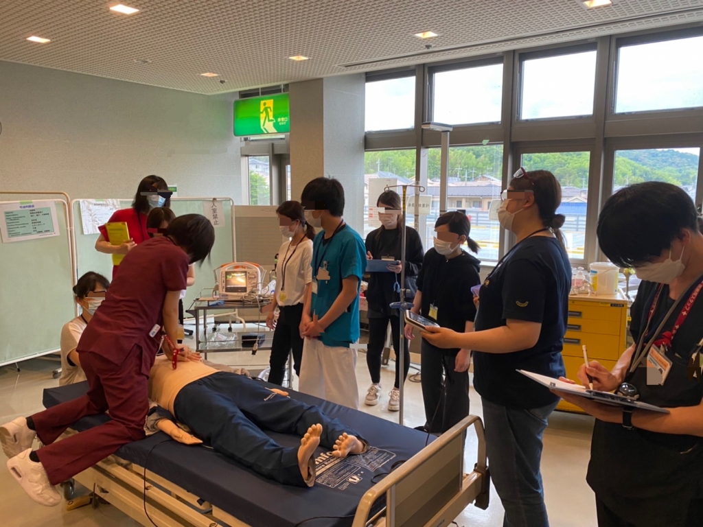 写真のようなモデル人形・実際の除細動機などを用いて、胸骨圧迫は正しい位置・速さ・深さで行えるか、除細動は波形に応じて電圧やモードを変え安全に使用できるか、気道確保では適正量で有効な換気ができているかなど、基本的な蘇生技術を学びました。体に染み込ませて、緊急時にも落ち着いて適切な手技が行えるようにしたいですね。