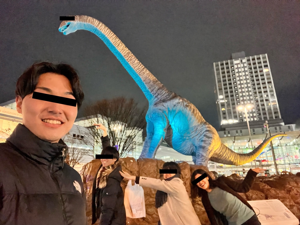 が、駅前の恐竜像の前ではしっかり写真を撮りましたよ。