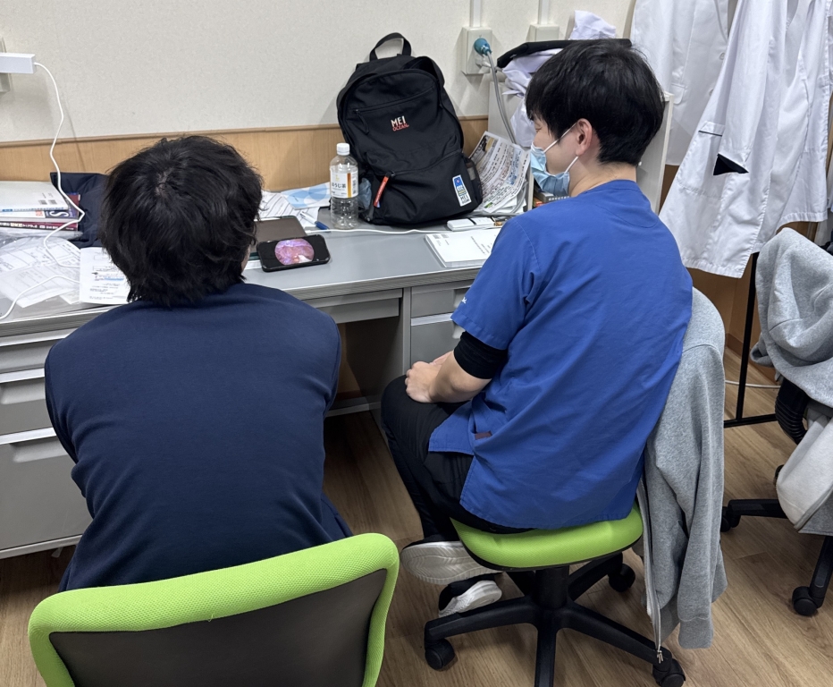 余談ですが、先日、いつも仲良い一年目&二年目コンビが、研修医室で手術動画を見ながら議論している姿を発見し、撮影に成功しました!